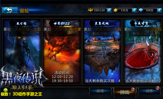 挑战中包括死亡塔、世界boss、黑翼之地、永夜古堡四大挑战区,死亡塔中有大量的装备和宝石,不限时间开启;世界boss拥有大量的金币和声望,每天有固定的时间开启;黑夜之地有大量的武器和宝石,有四次的挑战机会和四次购买挑战的机会;永夜古堡拥有大量的武器和高级宝石,取之不尽的宝藏等你来拿哦~