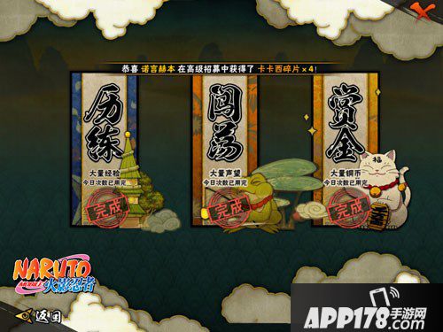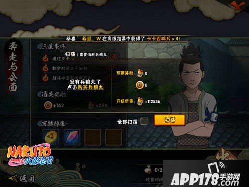 第四才是丰饶之间,丰饶之间的历练可以获得大量经验,但是里面可挑战的副本分为下忍、中忍、上忍和影这四个级别,很明显每一个级别的经验值都不一样,难度越高经验也就越多,同样这也是小编将历练放置最后一个的原因,很有可能前面的多次扫荡提升等级可开启后续难度的历练副本,可以获得更多经验哦。