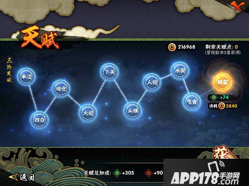天赋:在天赋系统中通过天赋点获取提升生命、攻击、防御三属性,首次三星通关副本即可获得天赋点。前期有充足的铜币、天赋点,切记不可忘了获取天赋点提升战力。