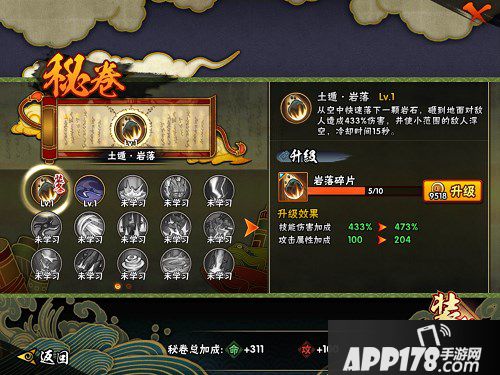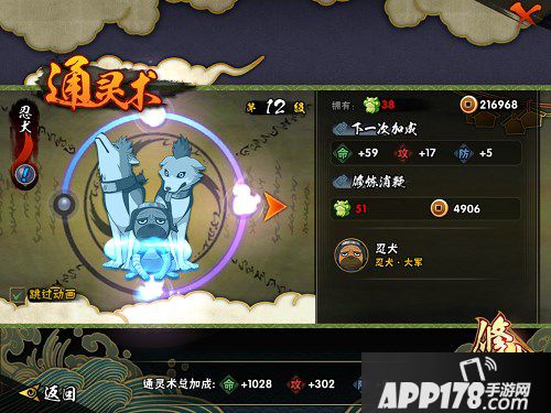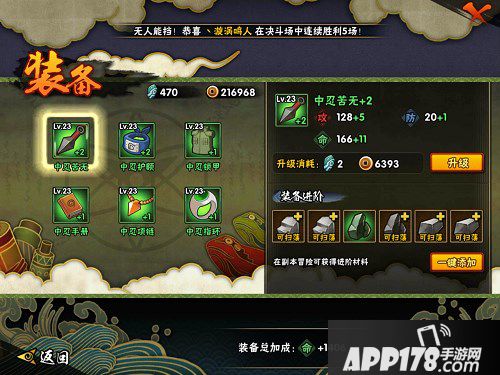 装备:装备的苦无、护额、锁甲等都是随着等级提升而获得的,前期或许装备不够多,但是能够升级、进阶可不要吝啬铜币消耗,每件装备增加的属性点不一样,故可升级或进阶的时候尽量升级哦~
