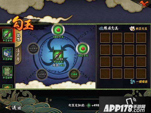 勾玉:勾玉可镶嵌与装备和通灵兽上,并且有6色勾玉,每种勾玉增加的属性点不一样,都是提升战力不可缺少的道具,勾玉的获取除去修行之路就是商城购买。在此期间有商城活动,可购买礼包获取更多2级勾玉提升战力哦