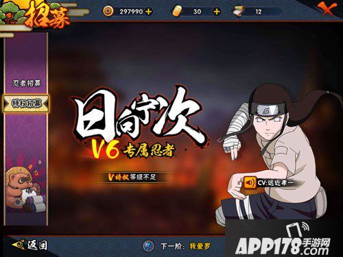 火影忍者手游中某些特定忍者是无法招募的,如宁次、我爱罗、卡卡西等,今天小编带来的是关于V6专属忍者日向宁次的介绍,感兴趣的就一起看看详情吧~