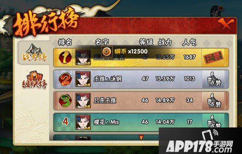 排行榜分为组织榜和战力榜两种,在战力榜中可以为你喜欢的角色点赞,从而获得大量铜币,被点赞的小伙伴也有相应收益(可看出战力值是非常重要的),小编目前点赞可获得1W+铜币,虽然每天只有一次坚持不懈才是王道啊。