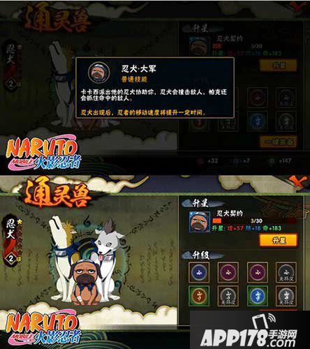 掌握了一级通灵术之后,只就可以与一级通灵兽——忍犬签订契约了。忍犬必须经过升星和装备符文来提高属性。而升星所需要的忍犬契约和升级需要的符文也都来自于试炼之地。契约主要来自于试炼之地的卡卡西和白关卡, 而符文的获得则通过扫荡和挑战试炼之地的木叶丸军团与木木。