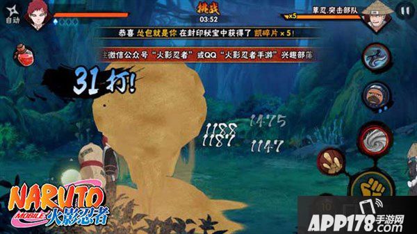 第一场景:本场景有两波敌人,均为4名草忍.突击部队和2名草忍.队长。在敌人出现的一瞬间,使用技能砂瀑送葬将场上的6名忍者聚集集中成一团给予重创。然后同敌人拉开距离,在敌人起身一刹那使用技能砂阵雨将其击飞。就这样来回使用2个小技能,慢慢消磨敌人的血量至死。如果在第一时间使用技能砂瀑送葬没有将6名忍者包裹集中,那么点击使用秘卷通灵·手里剑护身防止他们的突进近身攻击。