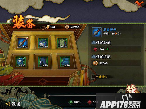 我们的装备共6件,分为武器,头饰,上衣,手部忍具,下装,鞋子,每一个装备的强化进阶都是不同的。玩家需在一定的等级才能进阶装备,而每10级强化就可以进阶一次了。每次强化可以属性加成一次。