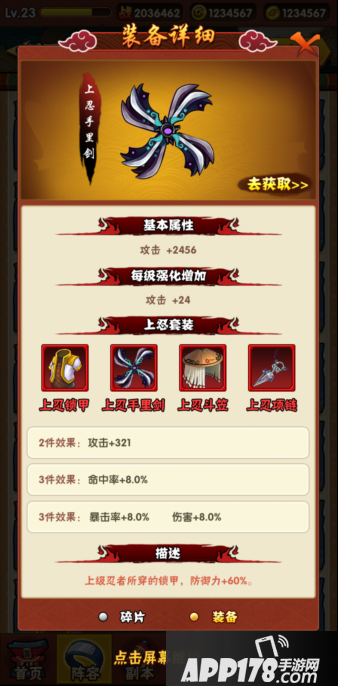 APP178手游网>火影忍者-忍者大师>游戏攻略>火影忍者-忍者大师装备系统简介-装备提升