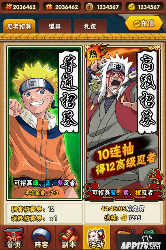 游戏中会根据各个阶段的不同情况调整相关的运营策略,活动中会有限时抽卡活动,活动开启期间玩家通过每天登陆领取的免费抽卡次数和消耗忍币的方式获得极品卡牌。