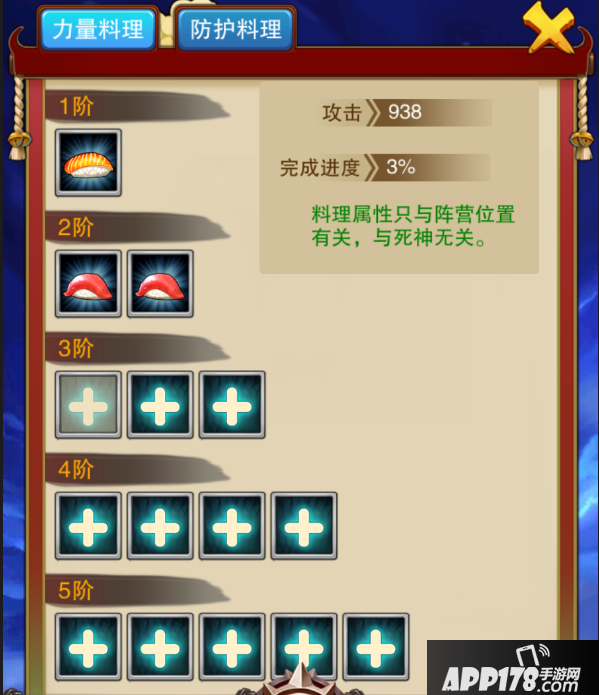 分有力量料理和防御料理,分别是加攻击和生命的,点击框框就能添加了料理了~
