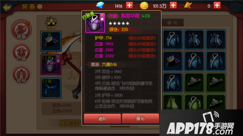 3、装备的属性:装备属性包括基础属性、强化羁绊和套装属性3个部分。