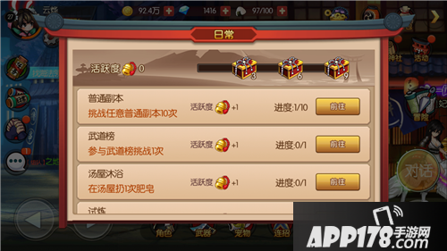 日常任务则是每天都有的,而且内容都差不多,实时竞技、日常购物、试炼、招财进宝等等,大致就是每天的活跃任务,完成任务数有活跃度,活跃度达到一定要求可以开启活跃宝箱,获得道具奖励。
