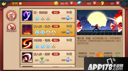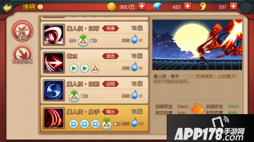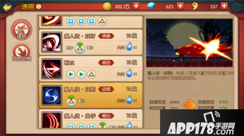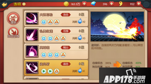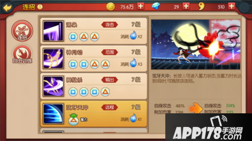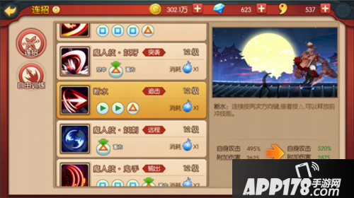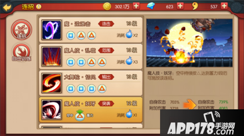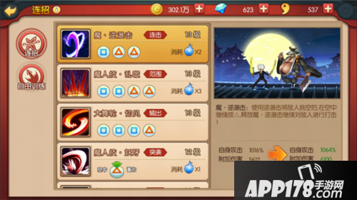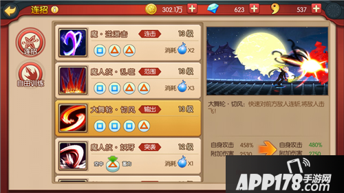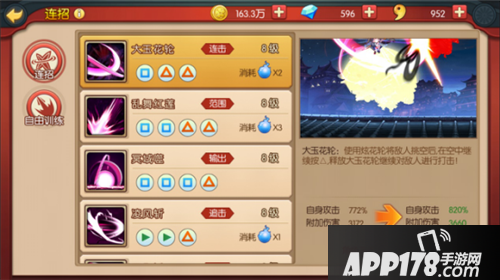 技能1:大玉花轮,将敌人挑空后在空中进行多段打击。消耗两点灵力。