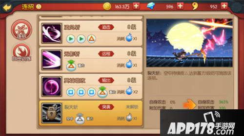技能7:裂天斩,空中蓄力技,从天而降并将敌人击飞,向前方及上方发动斩击。消耗一点灵力。