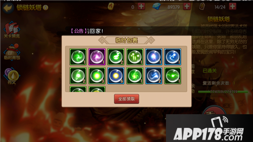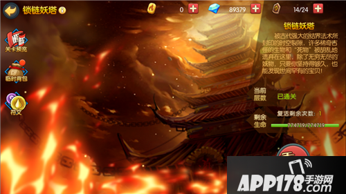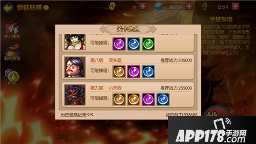 锁链妖塔,是简要概括来说,就是一个爬塔闯关的玩法,共九层,每一层通关都会随机获得对应关卡的掉落物品奖励。越高的层次难度越大,对战力、操作的要求更高。