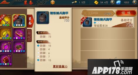 上面图中胸甲的详情上我们可以看到基础属性是防御+73