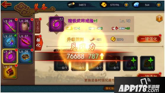 “一键强化”可以在资源充足的情况下,帮助主公把一件装备直接升到强化等级上限,并且自动跳转到下一件装备。