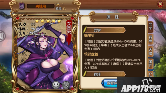 武学特性:怒技随机对敌方三位武将造成伤害附加25%晕眩几率,几率不高,还行吧。