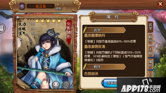 评语:玄之玄的主要用法是和忘金焉、欲星移组成就算队,很少能有12资的武将能在组合中占主位的,玄之玄的攻击偏软,靠武学特性【禁怒】慢慢磨死对方,所以在12资中玄之玄算很不错了的。