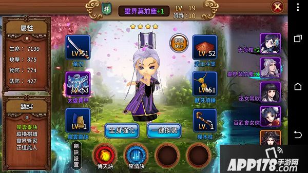 ▲装备等级、套装效果以及与角色间的羁绊关系亦会影响整体战力。一般来说只要按「一键换装」系统就会自动挑选出最佳组合穿上。