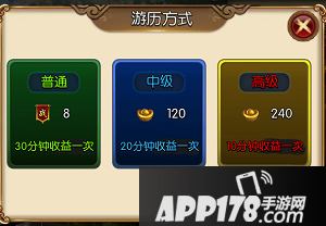 每一个游历区域可以添加一个5星英雄,花费一定的战旗或元宝设定游历的时间(4小时、8小时、12小时),和游历等级(普通、中级、高级),点击确定就可以开始游历了。