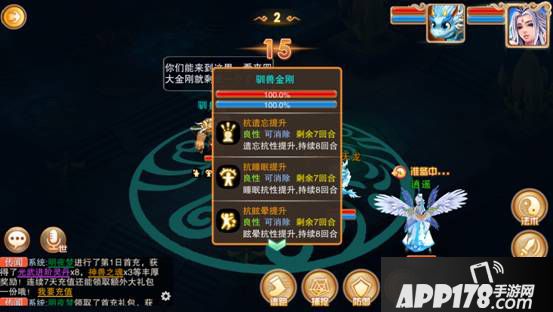 第一回合BOSS就会使用“定心”技能为自己附上各种提升控制技能抵抗的buff,如果队伍中没有逍遥,基本上我们可以放弃对BOSS使用控制技能了。