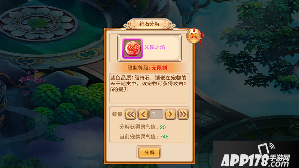灵气值可以通过分解符石获得,不同品质的符石分解所得的灵气值不同,品级越高分解所得灵气值越多,点击当前灵气值右边的“+”按钮即可进入到符石分解界面。