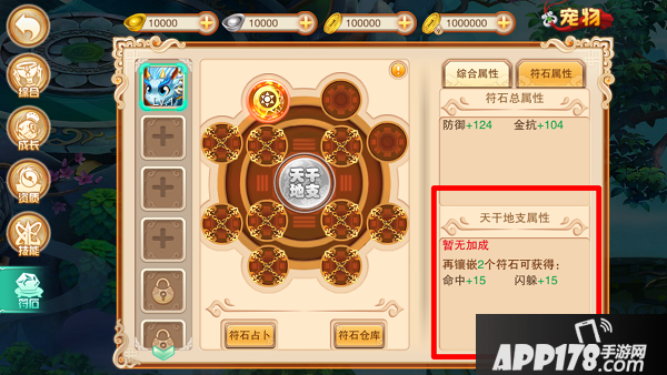 不同的符石提高的属性不同,另外当镶嵌符石到达一定数量后就能触发天干地支效果,额外增加天干地支属性