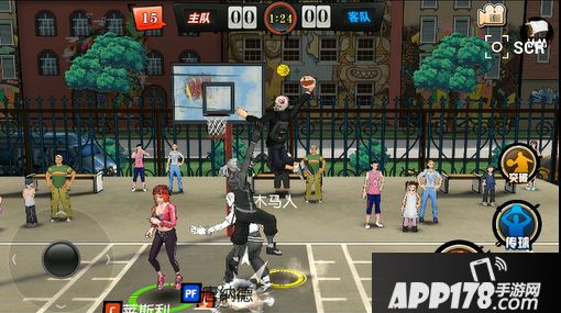 《街篮》的操作比较容易上手,游戏以虚拟摇杆式操作为主,屏幕左下方的摇杆控制人物移动,右下方的虚拟按键则可以完成进攻、释放进攻技能等动作。在非持球时间,你的技能全是防守技能;若在持球时间内,你的技能全是进攻技能。