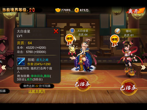 作为一度成为诸多玩家追捧的太白,无论是资质属性或是技能都足够强大。本身则也是作为肉盾的存在,虽然并不是加防御的技能,但其强力的回血技也足以令战局瞬间得以改变。技能的特性还能够同时打击两个敌人,并附带减伤和撕裂的状态。可谓是非常不错的辅助技能特效,接下来要介绍的哪吒以及敖广都将是很好的搭配对象。