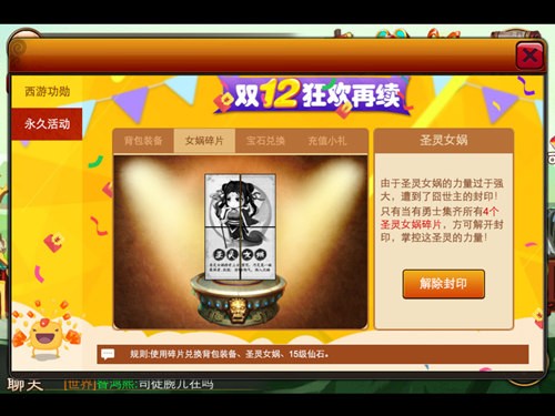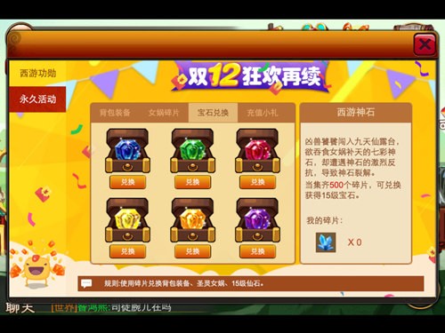 恶兽侵入了九天仙露台,造成了女娲补天神石的碎裂。目前共有6种15级的宝石可以兑换,当玩家集齐500个碎片就可以兑换,同样宝石碎片可以在每次的限时活动中获得。即使活动结束也可以随时到该永久活动中进行兑换。