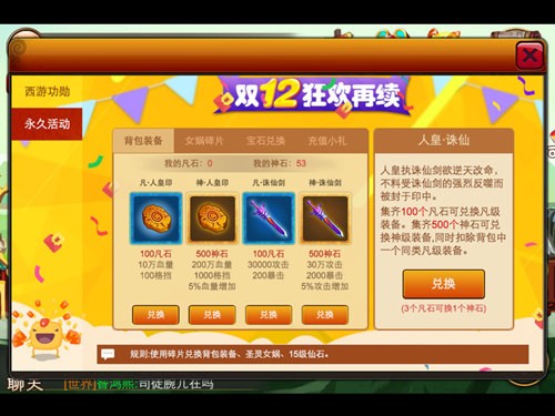 在永久活动中的背包装备中,分别有四把神器可兑换,两种人皇印和两把诛仙剑。各具不凡的属性,当然由不同的兑换材料可换得的神器也会有所不同。凡品的神器需要凡石,而神品的神器就需要神石,要兑换神品的神器先需通过集齐100个凡石才能兑换凡级的装备,接下来再集齐500个神石可兑换神级装备,此时需额外消耗一个同类的凡级装备。为了让玩家能够有更多的神石,3个凡石也可以直接兑换1个神石。