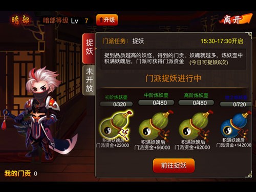 帮派内的暗部捉妖行动都是有时限性的,所以记得提醒帮派的小伙伴准时上线为帮派做贡献。开启时间为15:30-17:30,玩家可从不同的炼妖壶中进入来捕捉品质高的妖怪。当然品质越高,可以获得门贡、妖魄就会越多。目前,炼妖壶分为五种,初阶、中阶、高阶、地和天,积满妖魄后就会直接增加门派资金。要填满这5大炼妖壶可不是那么轻松的事情,所以赶紧叫上帮派的伙伴来捉妖吧!