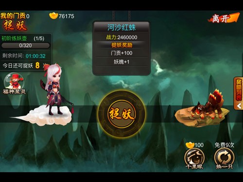 在遇到怪物后,可以直接查看当前怪物的战力和捕捉后的奖励,当然如果你不满意的话可以重新换一只,直到满意为止。还可以使用千里眼来直接找到橙色品质的妖怪,这样就可以省去不少时间。如果有元宝的玩家可以花费少量元宝召唤福神,让每一次的门贡和妖魄都能够获得双倍奖励。