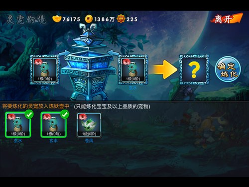 在灵宠幻境中,也有一处炼妖壶,不过该炼妖壶就真的只是炼妖的作用,将要炼化的灵宠直接放入后,就可以随机产生新的灵宠。而且也只有宝宝以上的品质宠物才能被炼化。想要获得更多更好资质的宠物可以在炼妖壶内来获得,材料也可以直接通过通灵召唤来获得。而在该界面中,还有一处镜中界,镜内布满了各种妖怪,当然也是宝物的获得地带。这里盛产灵宠内丹,打败镜中每一处场景的妖怪就可以直接获得。虽然挑战次数有限,不过每一轮都会必定碎片,所以一定不能错过。