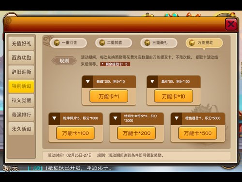 以旧换新,之前有剩余的材料都可以拿来转换,除材料进行熔炼,可随机获得5~15张万能提取卡。而这些万能提取卡可以到特别活动进行兑换,每次兑换奖励需花费对应数量的万能提取卡,不限次数。提取卡活动结束后清零,最少一张万能卡就可以兑换到器魂和积分,还有10张、100张、200张以及500张档次,最高可以直接获得橙色器灵。