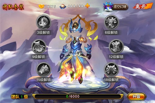 套装分为六件装备,分别由头盔、披风、护腕、战袍、战靴以及布裤等组合而成。该套装是团队的加成,并不只是指定某个伙伴,想要收集套装就先需要将团队的经验进行提升。通过经验丹才能升级,且分别需要3、6、9、12、15、18级来解锁相对应的部件。