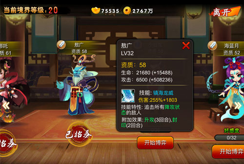 接下来到了游戏中期就可以选择敖广,从初期到中期的许多伙伴中很少能见到有追击降攻的英雄,敖广的作用不仅只是追击,而且其效果还附带升攻和封印,特别是封印能够让对方直接无法使用技能,对于游戏中后期的打斗都是至关重要。