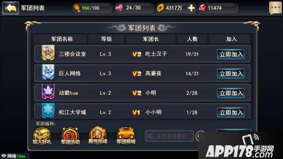 玩家可以通过点击游戏界面的“军团”按钮来进入军团界面。在军团界面中可以通过点击“申请”按钮来加入自己想要加入的军团,玩家可以同时申请加入多个军团,直到被其中的一个军团的管理批准加入。