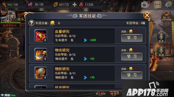 军团长在军团界面点击军团技能按钮后,可以看到军团技能的各种信息,军团技能可以带给军团成员属性上的加成,可以通过消耗士军团贡献升级。显然,军团技能的等级越高,那么对军团成员的属性加成也就越大。