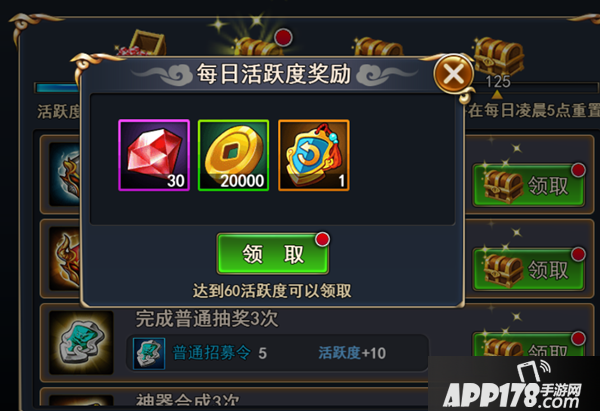 每个日常任务都有活跃度,只要活跃度达到一定的标准之后,除了日常领取的奖励之外,还能领取一个名为“活跃度奖励”的宝箱,内有各种宝石和金钱哦!