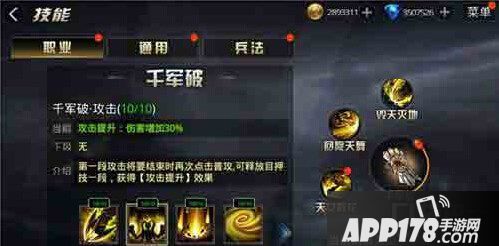 3、千军破·防御:使用后增加自身的攻击力10%~30%。