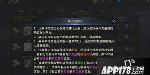 奖励:公会战的奖励很丰厚,进行公会战每成功一次或者失败两次,可以进行一次抽奖,奖品包含金币、钻石以及各种材料。另外,根据个人的表现,玩家还可以会的一定的武勋和积分,排行前十的玩家,可以获得稀有称号和稀有翅膀。