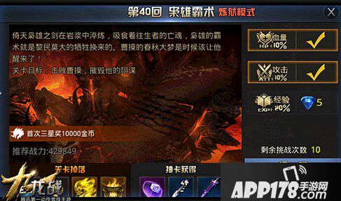 炼狱模式是九龙战中难度级别最高的关卡,无论是怪物等级还是战斗力都是异常强大。所以对于玩家的综合战力也有着相当高的需求。第40回枭雄霸术是BOSS关卡,所以在这个关卡中,玩家在击杀完第一轮的BOSS后,还将受到章节BOSS的挑战,困难也更胜从前。