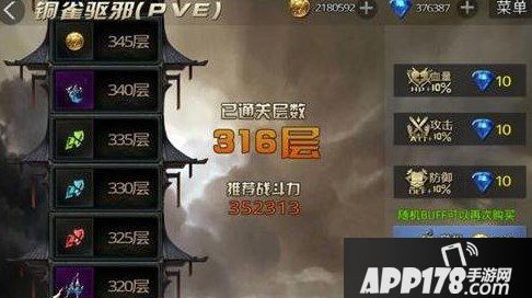 因为铜雀驱邪的奖励十分的诱人,所以玩家可以考虑花费几十个钻石,让自己挂上攻防血+10%的buff帮助自己闯塔,闯过后的奖励价值绝对远远高于这30个钻石。对了,在钻石buff下,花费500金币就能获得一个随机buff的选项,也要选中,当然,需要玩家不停的点击直到随机出自己想要的buff。
