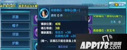初级魂石·杨铁心(唯一),魂石等级:蓝色3级,攻击力38、抗致残几率28。