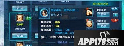 杨铁心镶嵌后增加攻击力、抗致残几率。初级品质为蓝色,最高可以升到粉色。