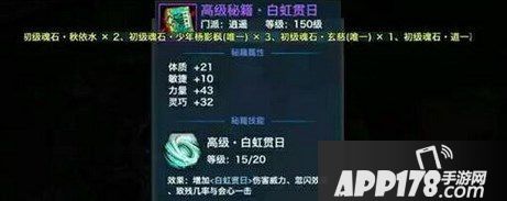 高级秘籍·白虹贯日:白虹贯日是逍遥的位移技能,在实战中可以配合轻功形成二段位移,再加上七探蛇盘的短暂无敌,可以让逍遥在战场上来去自如,灵活这一点是其他门派无法相比的。高级秘籍增加白虹贯日的伤害威力,但是很多时候白虹贯日难以命中对手,都作为位移来使用,所以增加伤害对逍遥的输出帮助有限,但是忽闪、致残几率、会心一击都能很好的提高逍遥的输出能力。