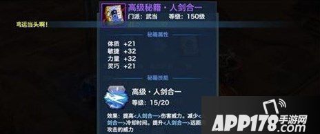 2、人剑合一高级秘籍效果为:提高人剑合一的基础攻击,由于目前还未能达到100级,所以猜测会在100%基础攻击的提高左右,人剑合一依旧会是群战之中收割人头跟回血的大杀器,就是略微逊色于剑飞惊天跟坐忘无我,再加上等级进阶要求为100级才可以,可以再第三本进阶再考虑人剑合一,如果等级未到又急着进阶天地无极,就可以排到最后。