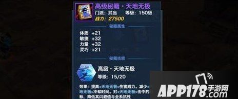 2、天地无极高级秘籍满级效果未知,目测应该是增加50%左右的基础伤害,降低的闪避跟数值估计不会有太大变化,综上所述的提升效果,远远不如剑飞惊天或者是坐忘无我的明显,所以建议天地无极进阶可以放到最后面再考虑进阶,毕竟进阶的成本还是比较贵的。