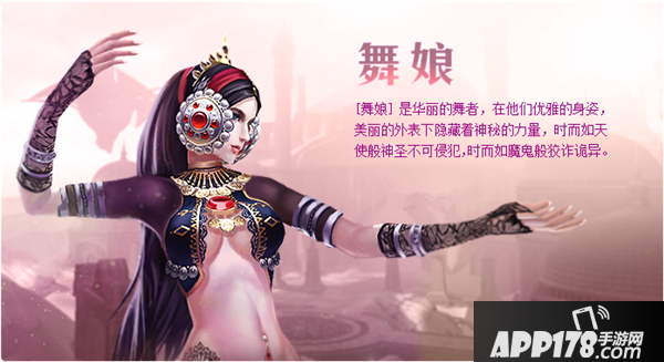 舞娘是天使和魔鬼的优雅化身 舞娘拥有华丽的身姿和优雅的舞步,然而在美丽的外表下却深藏着神秘的力量,同时拥有天使的神圣和魔鬼的狡诈。通过转职,玩家可以选择成为“先知”或者“魔女”,是团队中不可或缺的辅助职业。